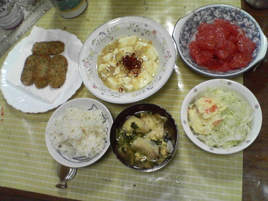 今日は麻婆豆腐などを頂きます。四川風麻婆豆腐らしきもの?揚物も頂きます。豆苗と卵とあぶらげのスープ、サラダも頂きます。グレープフルーツも・・今日もおいしく頂きました。