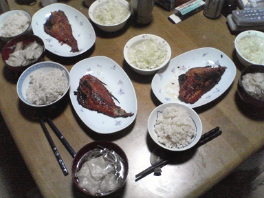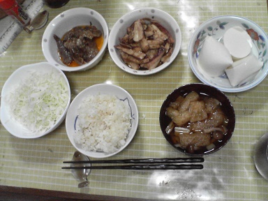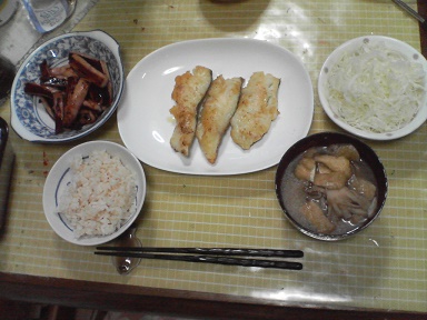今日は鱈などを頂きます。甘塩の鱈に唐揚げ粉をつけてオリーブ油で焼いたもの・・イカの一夜干しのバター焼き、味噌汁は舞茸とあぶらげ、キャベツサラダも頂きます。今日もおいしく頂きました。