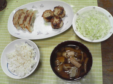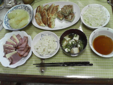 今日は餃子などを頂きます。普通の餃子、四角い焼売も・・おつまみ用のハムとチーズ?味噌汁は豆腐とワカメ、キャベツサラダも頂きます。グレープフルーツも・・今日もおいしく頂きました。