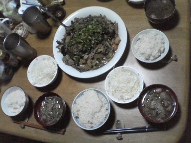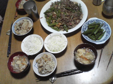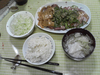 今日は中華炒めなどを頂きます。豚肉とタケノコ、蒲鉾、ハム、シシトウなどを炒めて中華ダシとオイスターソース、醤油などで味付けしたもの・・今日は炊き込み御飯。味噌汁はミックス野菜とあぶらげの野菜汁風、キャベツサラダも頂きます。オクラの漬物も・・今日もおいしく頂きました。
