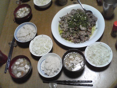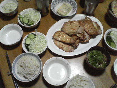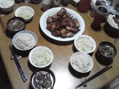 今日は豚肉などを頂きます。素焼とタレ焼き・・春巻も頂きます。味噌汁は麩とワカメと豆腐、キャベツサラダも頂きます。今日もおいしく頂きました。