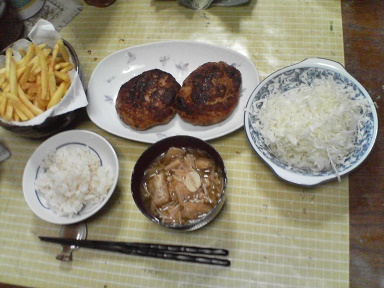 今日はハンバーグなどを頂きます。市販の素で作ったハンバーグ、少々焦げ気味・・ポテトフライも頂きます。汁物はエノキとあぶらげ、キャベツサラダも頂きます。今日もおいしく頂きました。