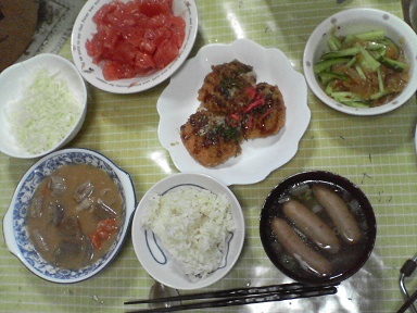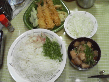 今日はそうめんなどを頂きます。普通のそうめん・・おかずは揚物、汁物はシメジとはんぺんを麺つゆで煮たもの、麺と揚物をつけて頂きます。キャベツサラダも頂きます。今日もおいしく頂きました。