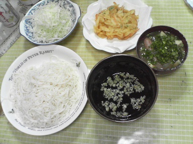 今日はそうめんなどを頂きます。普通のそうめん・・かき揚げ、ソーセージと玉葱などのスープ・・キャベツサラダも頂きます。今日もおいしく頂きました。