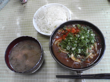 今日はカレーうどんなどを頂きます。前回のカレーを流用、うどんにかけてネギをトッピング、味噌汁は豆苗とあぶらげ、前回の流用・・キャベツサラダも頂きます。今日もおいしく頂きました。