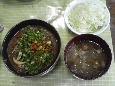 今日はカレーうどんなどを頂きます。前回のカレーをうどんにかけたもの・・汁物は前回のベーコンとキャベツのスープを流用、キャベツサラダも頂きます。今日もおいしく頂きました。