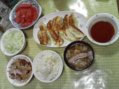 今日は餃子などを頂きます。普通の餃子・・おつまみ用のメンマと焼き豚が余っていたので頂きます。ワンタンスープ、なぜかソーセージ入り?キャベツサラダも頂きます。グレープフルーツも・・今日もおいしく頂きました。