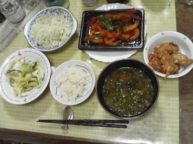 今日は揚物などを頂きます。市販の揚物、お好み焼き風とかいうもの?もつ煮込みも頂きます。中華クラゲと胡瓜の和え物、ソーセージとネギのスープ、キャベツサラダも頂きます。グレープフルーツも・・今日もおいしく頂きました。