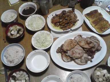今日は餃子と焼売などを頂きます。餃子と焼売、暑くて食欲不振のため少量・・汁物はシメジとあぶらげを麺つゆで煮たもの、キャベツサラダも頂きます。今日もおいしく頂きました。