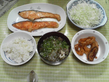 今日はシャケなどを頂きます。オリーブ油で焼いた甘塩のシャケ、イカのおつまみが余っていたので頂きます。挽肉とキャベツのスープ、キャベツサラダも頂きます。今日もおいしく頂きました。