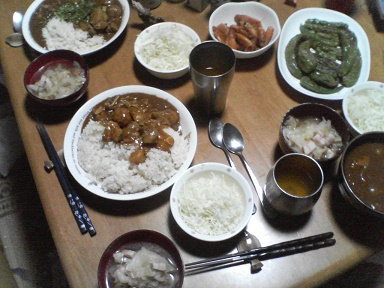 今日はカレーなどを頂きます。普通のポークカレー、好みでネギをトッピング・・こちらはカレー丼?小エビの揚物、ししとう炒めも頂きます。ベーコンとキャベツのスープ、キャベツサラダも頂きます。今日もおいしく頂きました。