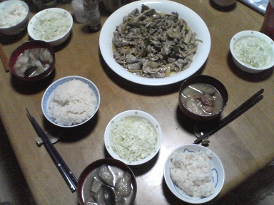 今日は豚肉などを頂きます。豚肉とタケノコとピーマンなどを炒め、中華ダシとオイスターソース、ガーリックなどで味付けしたもの、味噌汁は茄子と油麩、キャベツサラダも頂きます。今日もおいしく頂きました。