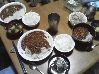 今日はカレーなどを頂きます。キーマカレーらしきもの?味噌汁はジャガイモとワカメ、キャベツサラダも頂きます。今日もおいしく頂きました。