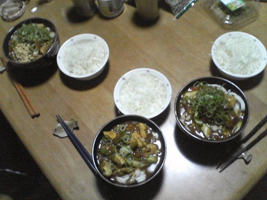 今日はカレーうどんなどを頂きます。前回のカレーに鶏肉とネギを追加、麺つゆを少々加えて温めたうどんにかけて頂きます。キャベツサラダも頂きます。今日もおいしく頂きました。