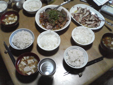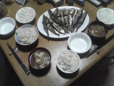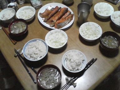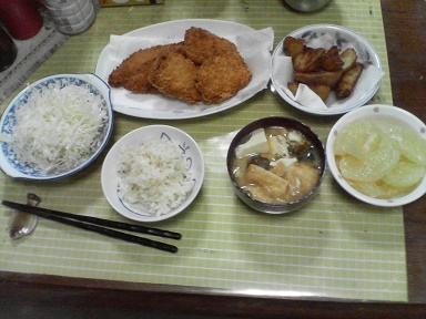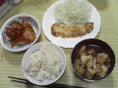 今日は鱈などを頂きます。唐揚げ粉をつけてオリーブ油で焼いた甘塩の鱈・・揚げ餃子が余っていたので頂きます。味噌汁はシメジと揚げ豆腐、今日もおいしく頂きました。