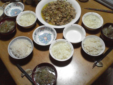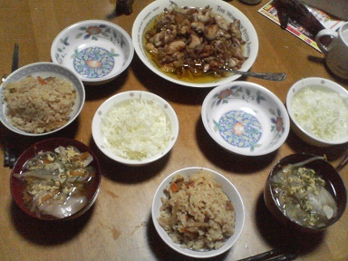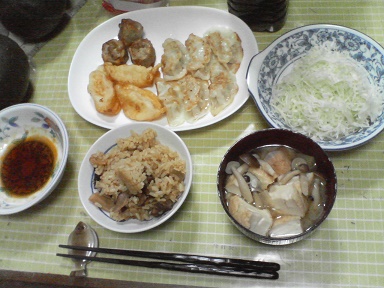 今日は餃子と焼売などを頂きます。揚げ餃子、普通の餃子、揚げ焼売など、今日は炊き込み御飯、味噌汁はシメジと揚げ豆腐、キャベツサラダも頂きます。今日もおいしく頂きました。