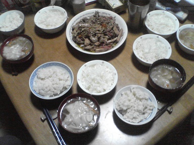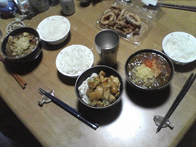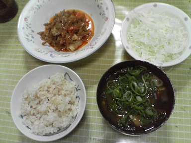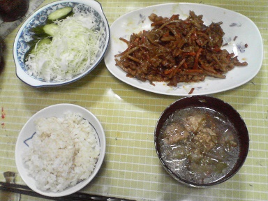今日は豚肉とゴボウ炒めなどを頂きます。豚肉とゴボウ、人参などを炒めたもの・・野菜スープ?キャベツサラダも頂きます。今日もおいしく頂きました。