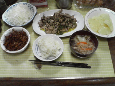 今日はホルモン焼などを頂きます。豚ホルモンのネギ塩焼き・・ゴボウ炒めも頂きます。汁物は前回のスープを流用、キャベツサラダも頂きます。グレープフルーツも・・今日もおいしく頂きました。