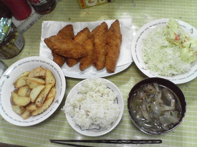 今日は白身魚フライなどを頂きます。冷凍物の白身魚フライ、ポテトフライも頂きます。ソーセージと野菜のスープ、キャベツサラダも頂きます。今日もおいしく頂きました。