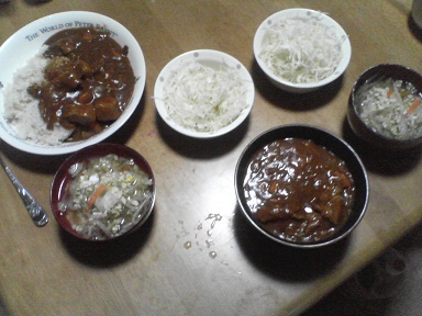 今日はカレーなどを頂きます。普通のポークカレー?鶏挽肉とミックス野菜のスープ、キャベツサラダも頂きます。今日もおいしく頂きました。