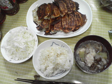 今日は餃子などを頂きます。羽根付き餃子らしきもの?少々焦げ気味・・シメジと鶏団子のスープ、キャベツサラダも頂きます。今日もおいしく頂きました。
