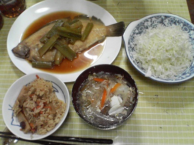 今日はカレイなどを頂きます。カレイの煮物・・炊き込み御飯、鶏挽肉とミックス野菜のスープ、キャベツサラダも頂きます。今日もおいしく頂きました。