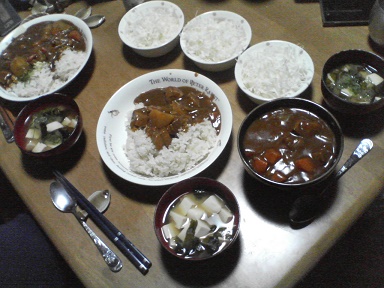 今日はカレーなどを頂きます。普通のポークカレー?味噌汁は豆腐とワカメ、キャベツサラダも頂きます。今日もおいしく頂きました。