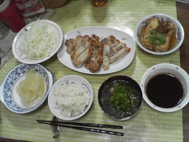 今日は鶏肉などを頂きます。鶏肉と鶏皮をオリーブ油で焼いて塩コショーとガーリックで味付けしたもの、炊き込み御飯、野菜と卵のスープにワンタンをいれたもの・・キャベツサラダも頂きます。今日もおいしく頂きました。