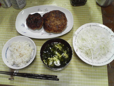 今日はハンバーグなどを頂きます。市販の素で作ったハンバーグ、少々焦げ気味?ワカメと卵のスープ、キャベツサラダも頂きます。今日もおいしく頂きました。