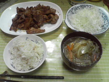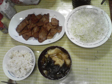 今日は豚肉などを頂きます。豚肉の味噌漬け?味噌汁はワカメとあぶらげ、キャベツサラダも頂きます。今日もおいしく頂きました。
