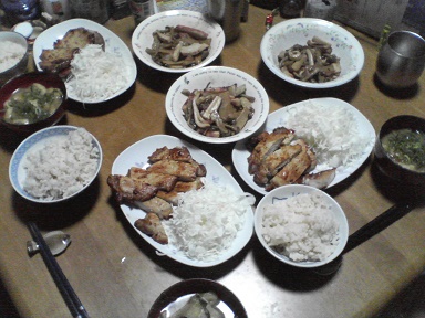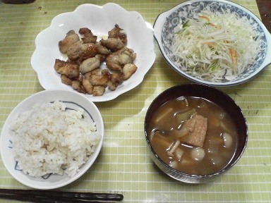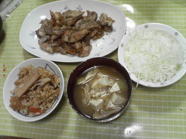 今日は鶏肉などを頂きます。鶏肉の塩コショー焼き・・今日は炊き込み御飯、味噌汁は舞茸と豆腐、キャベツサラダも頂きます。今日もおいしく頂きました。