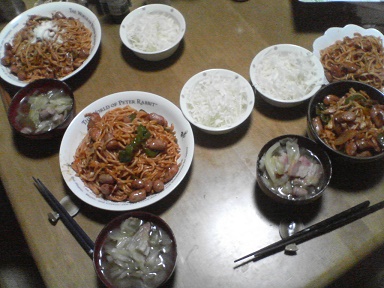 今日はパスタなどを頂きます。ナポリタン風?キャベツ、ベーコン、ソーセージなどのスープ、キャベツサラダも頂きます。今日もおいしく頂きました。