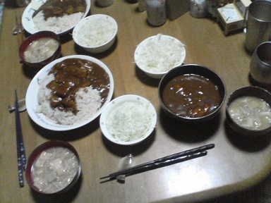 今日はカレーなどを頂きます。普通のポークカレー?味噌汁はエノキとあぶらげ、キャベツサラダも頂きます。今日もおいしく頂きました。