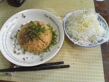 今日は炒飯などを頂きます。市販の素で作った炒飯?余った御飯を流用、具材がない・・キャベツサラダも頂きます。今日もおいしく頂きました。