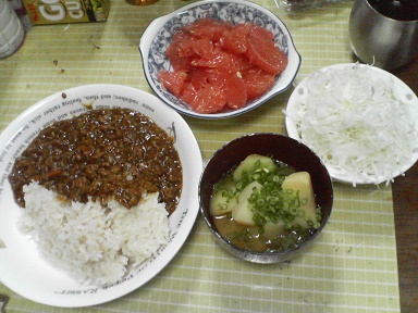 今日はカレーなどを頂きます。キーマカレーらしきもの?ジャガイモの味噌汁にネギをトッピング、キャベツサラダも頂きます。グレープフルーツも・・今日もおいしく頂きました。