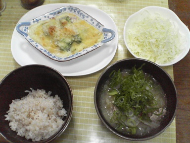 今日はグラタンなどを頂きます。普通のマカロニグラタン?汁物は豚汁風?キャベツサラダも頂きます。今日もおいしく頂きました。