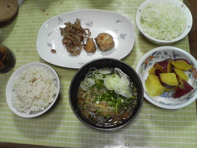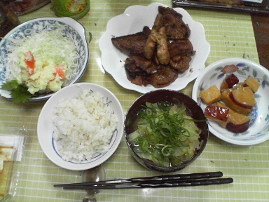 今日は鶏肉などを頂きます。鶏皮焼きと鶏肉塩コショー焼き、おつまみ用?サツマイモの煮物、ミックス野菜のスープ?ネギ大盛・・キャベツサラダも頂きます。今日もおいしく頂きました。