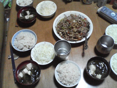 今日は炒め物などを頂きます。豚肉、シメジ、タケノコ、人参、ネギなどをオリーブ油で炒めて中華ダシで味付けしたもの・・味噌汁は豆腐とワカメ、キャベツサラダも頂きます。今日もおいしく頂きました。