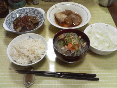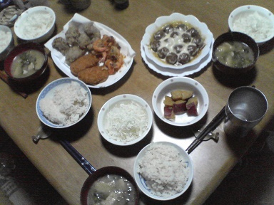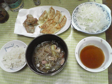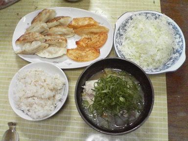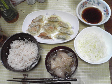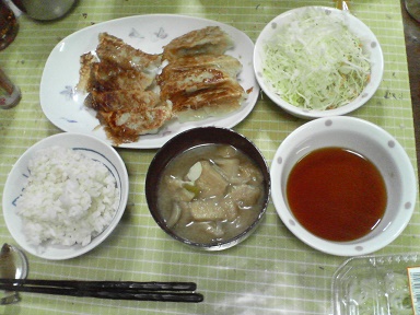 今日は餃子などを頂きます。普通の餃子?味噌汁は舞茸とあぶらげ、キャベツサラダも頂きます。今日もおいしく頂きました。