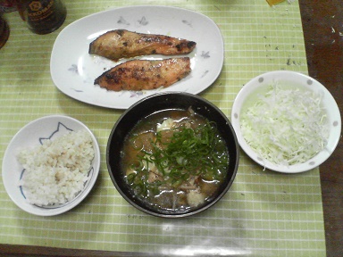 今日はシャケなどを頂きます。オリーブ油で焼いた味噌漬のシャケ、汁物は前回のそばのかけ汁を流用、キャベツサラダも頂きます。今日もおいしく頂きました。