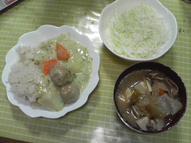 今日はシチューなどを頂きます。鶏団子入りのシチュー、汁物は前回の豚汁を流用、キャベツサラダも頂きます。今日もおいしく頂きました。