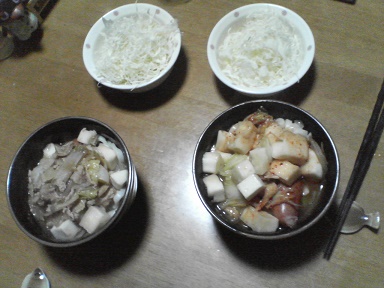 今日はうどんなどを頂きます。有り合わせの具材を煮込んでうどんにかけて頂きます。キャベツサラダも頂きます。今日もおいしく頂きました。