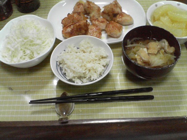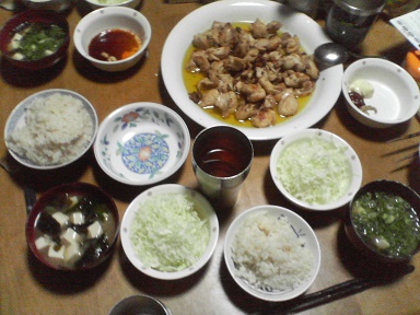 今日は鶏肉などを頂きます。オリーブ油で焼いた鶏肉、ガーリックと塩コショーで味付け・・味噌汁は豆腐とワカメ、キャベツサラダも頂きます。今日もおいしく頂きました。