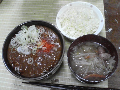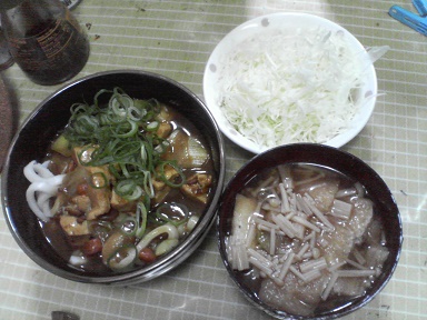 今日はカレーうどんなどを頂きます。前回のカレーに鶏肉とネギを追加、麺つゆを少々加えてうどんにかけて出来上がり・・味噌汁はエノキとあぶらげ、キャベツサラダも頂きます。今日もおいしく頂きました。