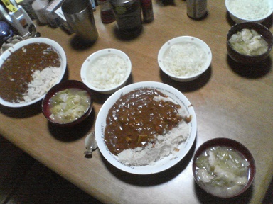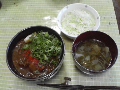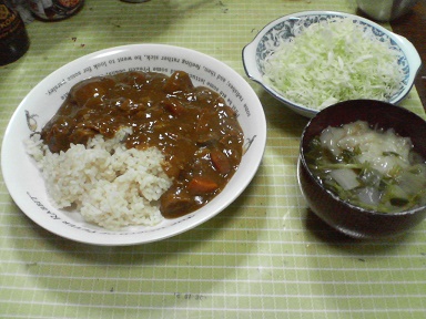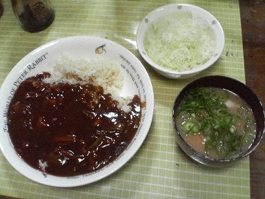 今日はカレーなどを頂きます。普通のポークカレー?味噌汁はキャベツとあぶらげ、キャベツサラダも頂きます。今日もおいしく頂きました。