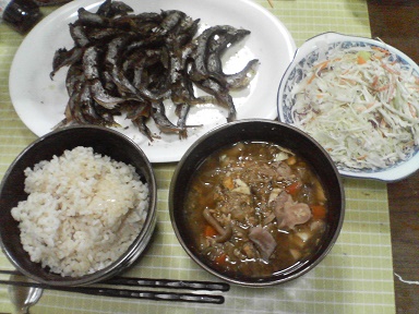 今日はシシャモなどを頂きます。オリーブ油で焼いたオスのシシャモ、汁物は前回の野菜スープのアレンジ品、サラダも頂きます。今日もおいしく頂きました。