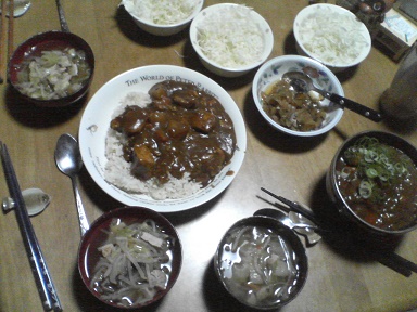 今日はカレーなどを頂きます。普通のポークカレー?ワンタンスープ、キャベツサラダも頂きます。今日もおいしく頂きました。