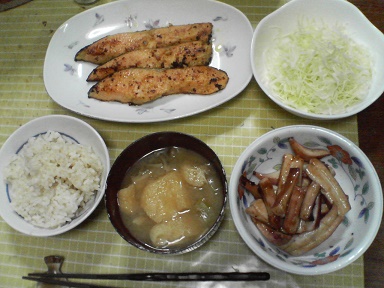 今日はシャケなどを頂きます。オリーブ油で焼いた味噌漬のシャケ・・イカのバター焼き、味噌汁はシメジとあぶらげキャベツサラダも頂きます。