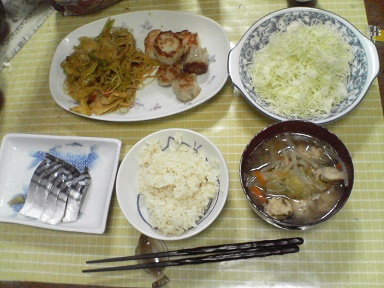 今日はビーフンなどを頂きます。カレー風味のビーフン?焼売も・・〆鯖が余っていたので頂きます。鶏団子とミックス野菜のスープ、キャベツサラダも頂きます。今日もおいしく頂きました。