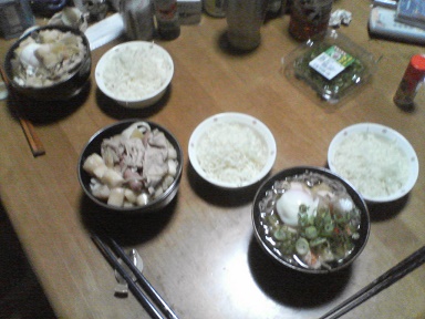 今日は鶏大根などを頂きます。鶏大根、レトルト品・・麻婆茄子が余っていたので頂きます。前回のスープに春雨をいれたもの・・キャベツサラダも頂きます。今日もおいしく頂きました。